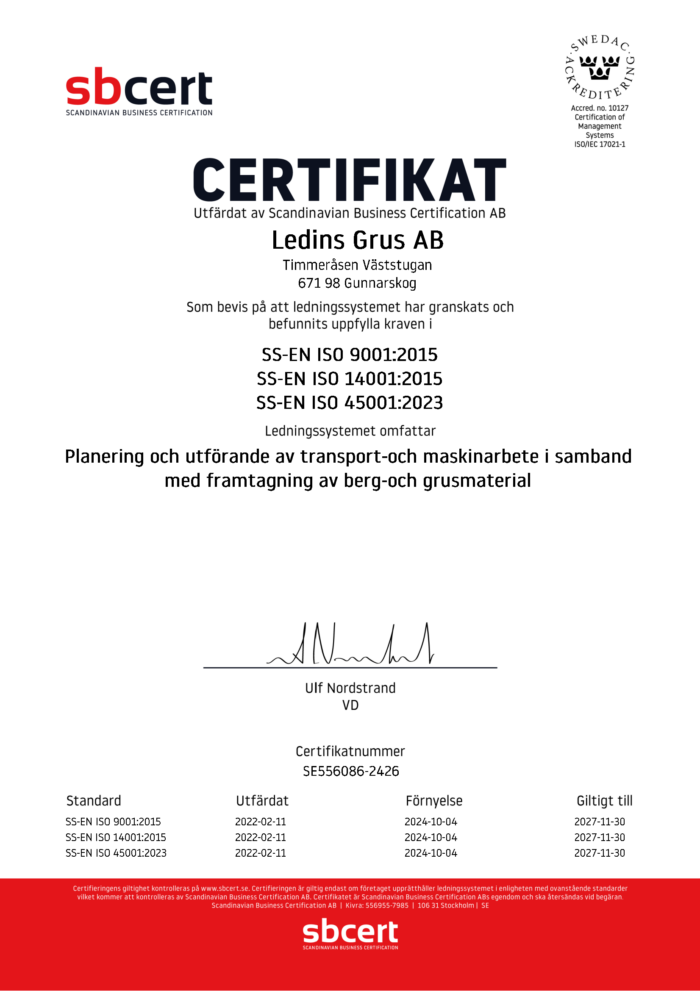 Vi är certifierande enligt ISO 9001 Kvalitet, ISO 14001 Miljö och ISO 45001 Arbetsmiljö.